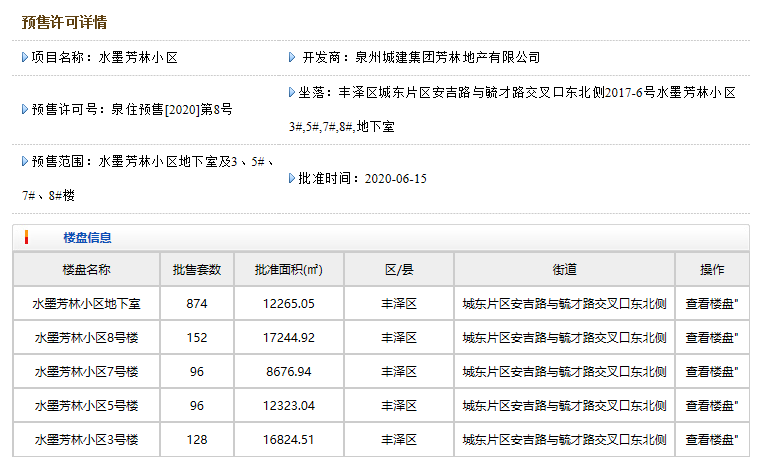 6月15日,据泉州住建局网站显示位于城东板块的城建水墨芳林3#、5#、7#、8#,地下室获批预售,其中,住宅房源224套,住宅均价:18019元/㎡,价格区间:16737.67-18832元/㎡。