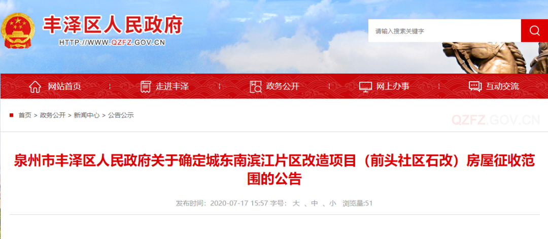 7月17日,丰泽区人民政府官网发布了《泉州市丰泽区人民政府关于确定城东南滨江片区改造项目(前头社区石改)房屋征收范围的公告》,这预示着备受瞩目的城东南江滨片区改造有了新进展。
