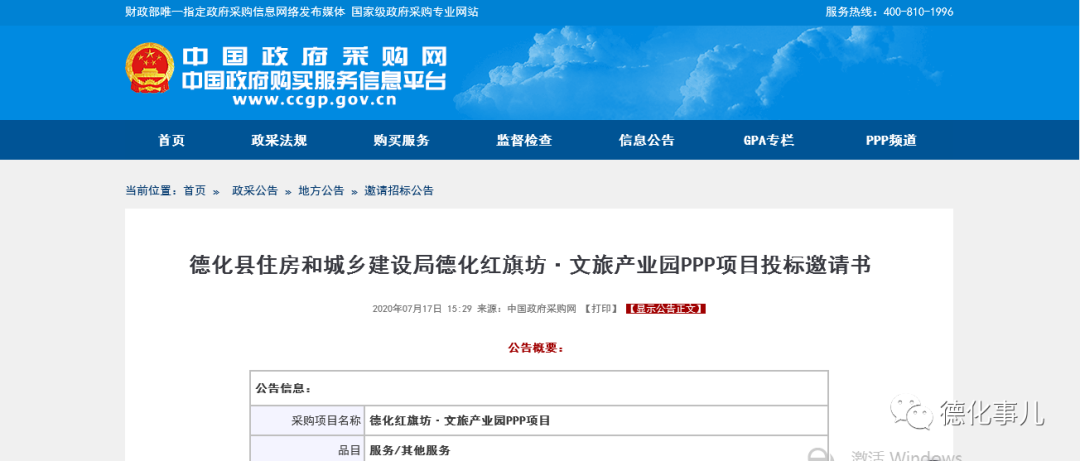 7月17日,中国政府采购网发布了《德化县住房和城乡建设局德化红旗坊·文旅产业园PPP项目投标邀请书》。该《邀请书》载明,德化红旗坊·文旅产业园PPP项目投标工作拟于2020年08月07日 09:00开标,项目预算金额130363.14万元人民币,竞标者可于2020年07月17日至2020年07月31日