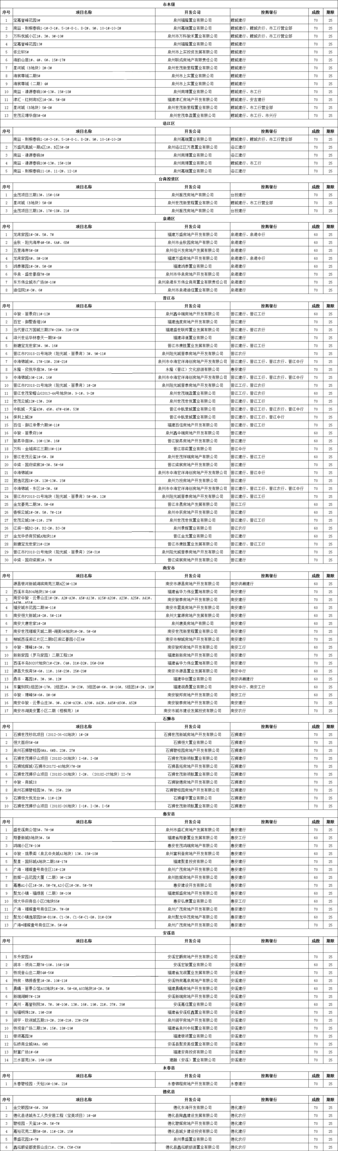 市本级、洛江区、台商区可公积金贷款楼盘共有21个项目,首套最高均可贷款70%。此外,石狮市、永春、德化三地共17个项目,也是首套最高均可贷款70%。泉港、晋江、南安、惠安、安溪共84个项目,部分首套最高可贷款60%,部分首套最高可贷款70%。