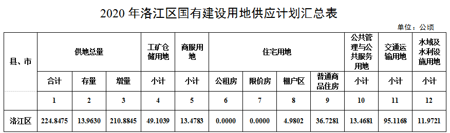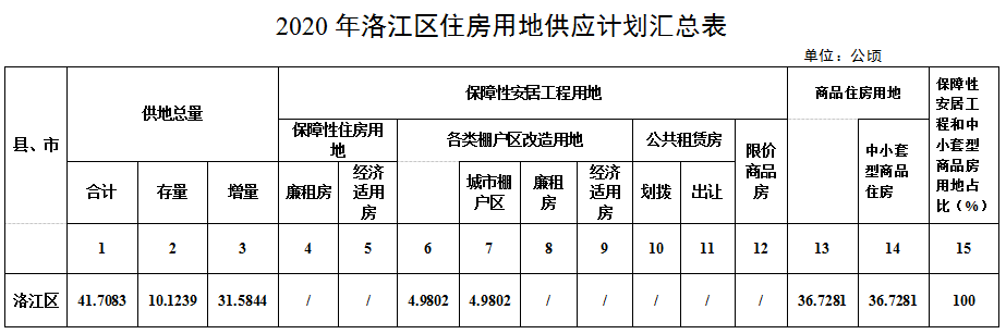 2020年洛江区住房用地供应计划合计417083㎡,其中商品住房用地367281㎡、棚改用地49802㎡。