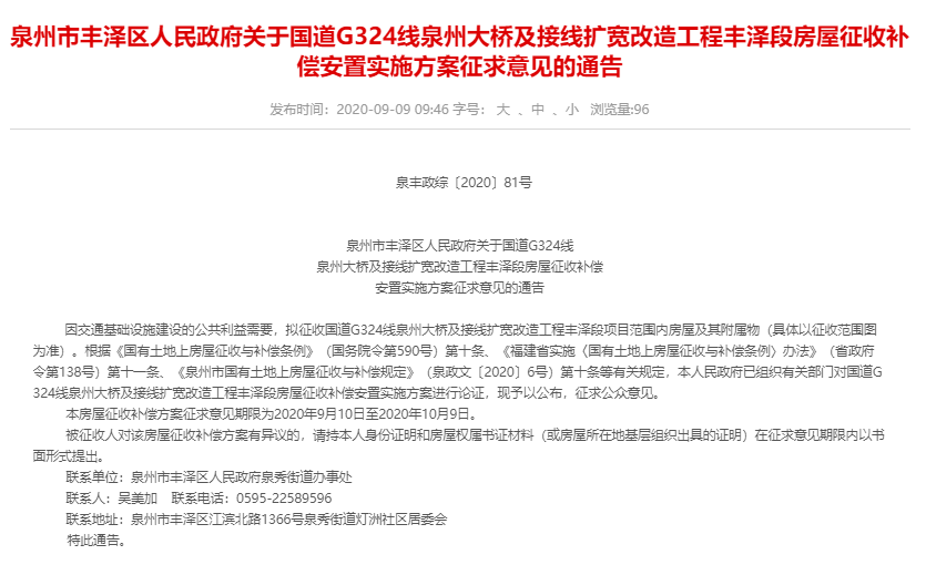 9月9日,泉州市丰泽区人民政府发布了关于国道G324线泉州大桥及接线扩宽改造工程丰泽段房屋征收补偿安置实施方案征求意见的通告。