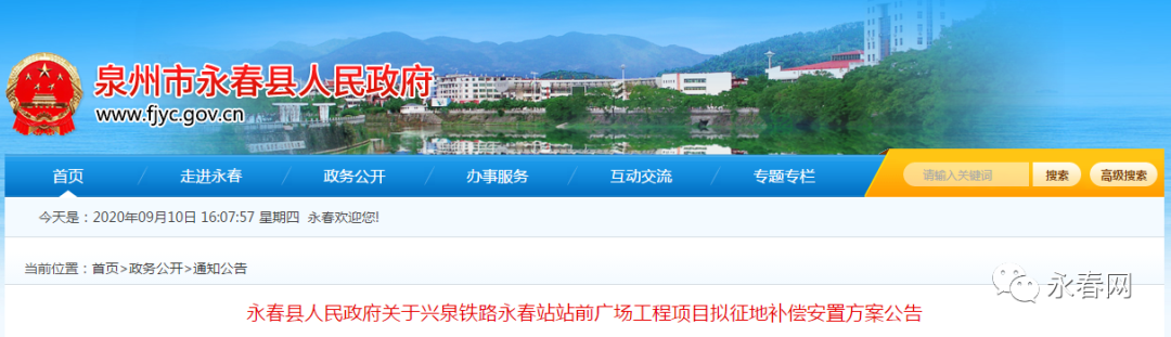 9月10日,永春县人民政府网发布永春县人民政府关于兴泉铁路永春站站前广场工程项目拟征地补偿安置方案公告。