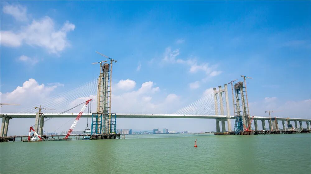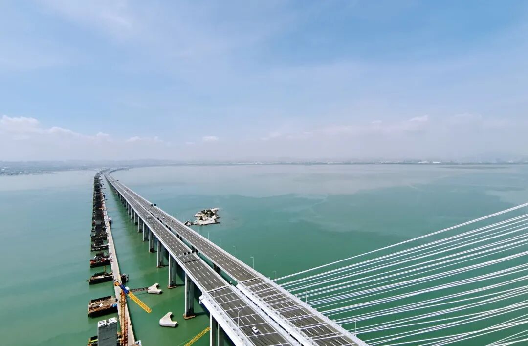 泉州湾跨海大桥是在建的福厦高铁的重点控制性工程,全长20.287公里,连接晋江新塘与惠安,海上桥梁长8.96公里,跨越泉州湾的主桥长800米、主跨400米,为双塔双索面钢混结合梁半漂浮体系斜拉桥,这也是国内首座跨海高速铁路桥,该大桥由中交二航局承建。