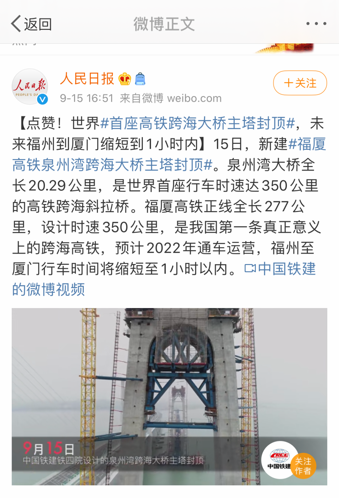 9月15日,全国首座高铁跨海大桥福厦高铁泉州湾跨海大桥取得新进展主塔封顶!