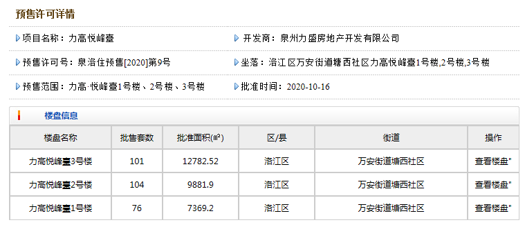 据泉州住建局最新信息显示,位于洛江万安板块力高·悦峰臺1#、2#、3#楼取得预售证,共281住宅获批预售,价格为3500元/㎡。据悉这三栋楼房源为政府回购,暂不出售。