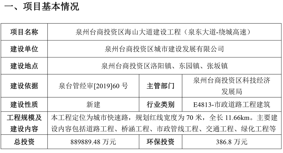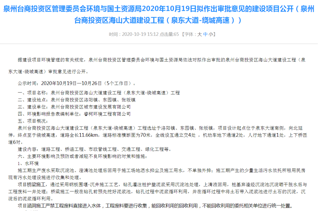 10月19日,台商投资区环境与国土资源局对“海山大道建设工程(泉东大道-绕城高速)”审批意见进行公开。