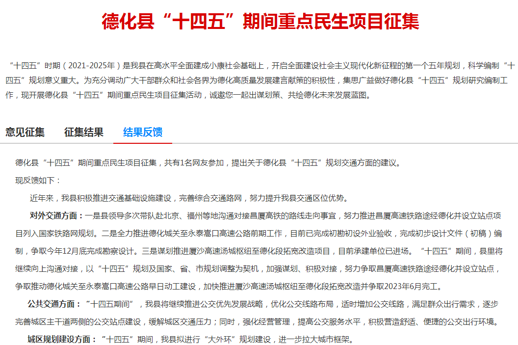 近日,德化县人民政府门户网站开展了德化县“十四五”期间重点民生项目民意征集活动。有网友以“关于德化县‘十四五’规划交通方面的建议”为题在活动中留言:在昌厦高铁等大项目上,能够取得重大突破,争取昌厦高铁途经德化并设立站点。