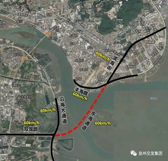 东海通道起于双龙路,横过晋江岸沿海大通道、晋江、泉州岸沿海大通道,终于滨海街。该通道拟采用隧道下穿晋江入海口后对接丰泽区滨海街(综合大道),总投资估算约52.45亿元,路线全长约4.8公里,其中隧道长约4.235公里(含敞开段)。