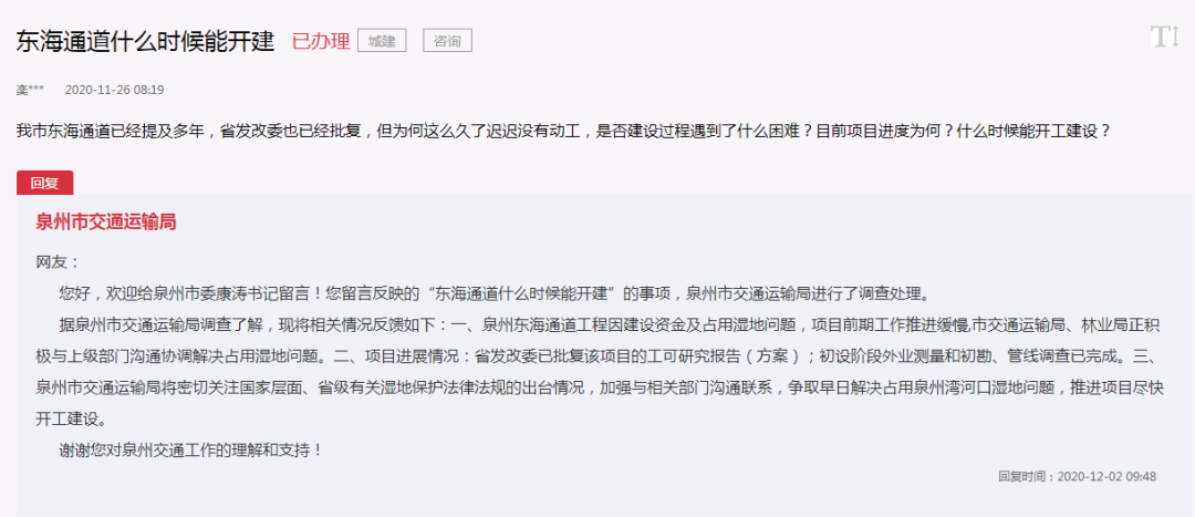 泉州市交通运输局12月2日回复到: