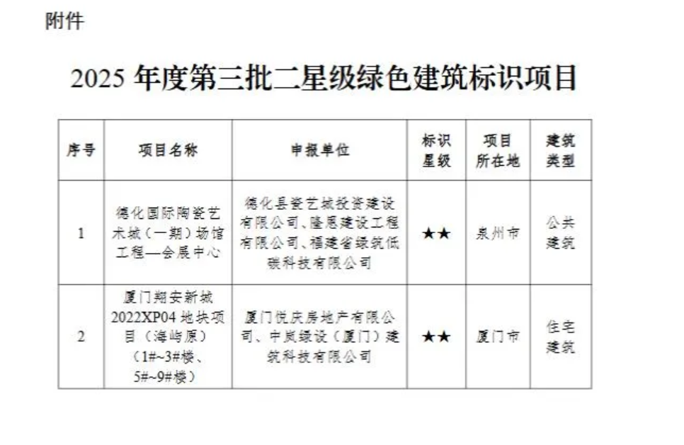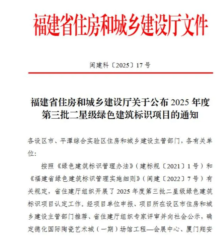 2025年8月20日,福建建省住房和城乡建设厅发布“关于公布2025年度第三批二星级绿色建筑标识项目的通知”。
