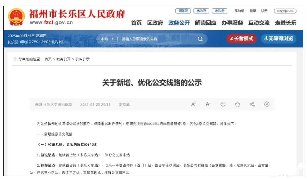 2025年9月23日,福州市长乐区交通运输局发布“关于新增、优化公交线路的公示 ”。为做好福州地铁滨海快线接驳服务,保障市民出行便利。经研究决定自2025年9月26日起新增3条、优化8条公交线路。