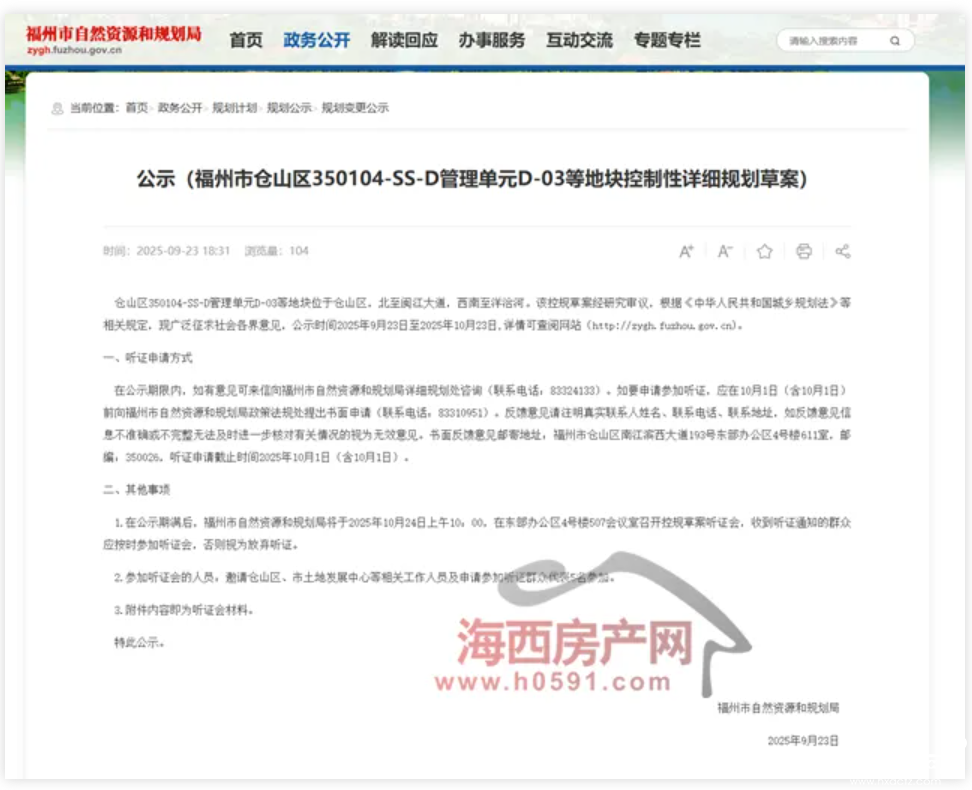 9月23日, 福州市自然资源和规划局发布“福州市仓山区350104-SS-D管理单元D-03等地块控制性详细规划草案公示”。
