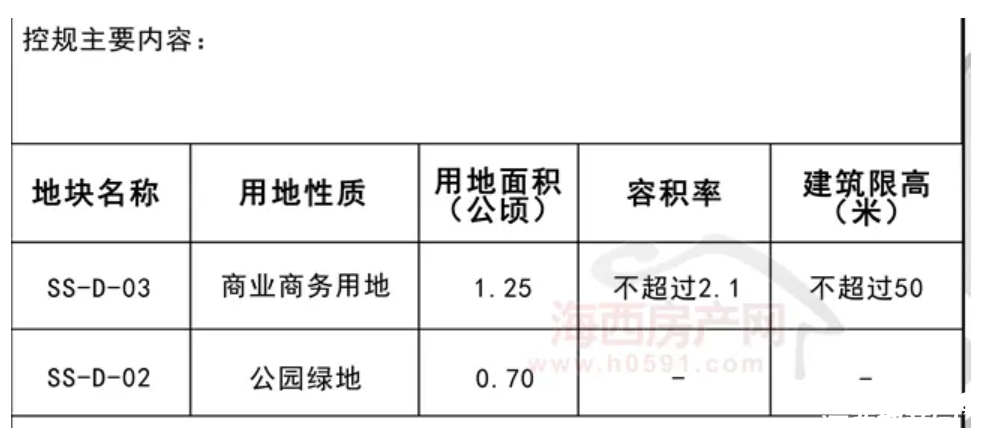 仓山区350104-SS-D管理单元D-03地块用地性质为商业商务用地,用地面积1.25公顷(18.75亩),容积率不超过2.1,建筑限高不超过50米。