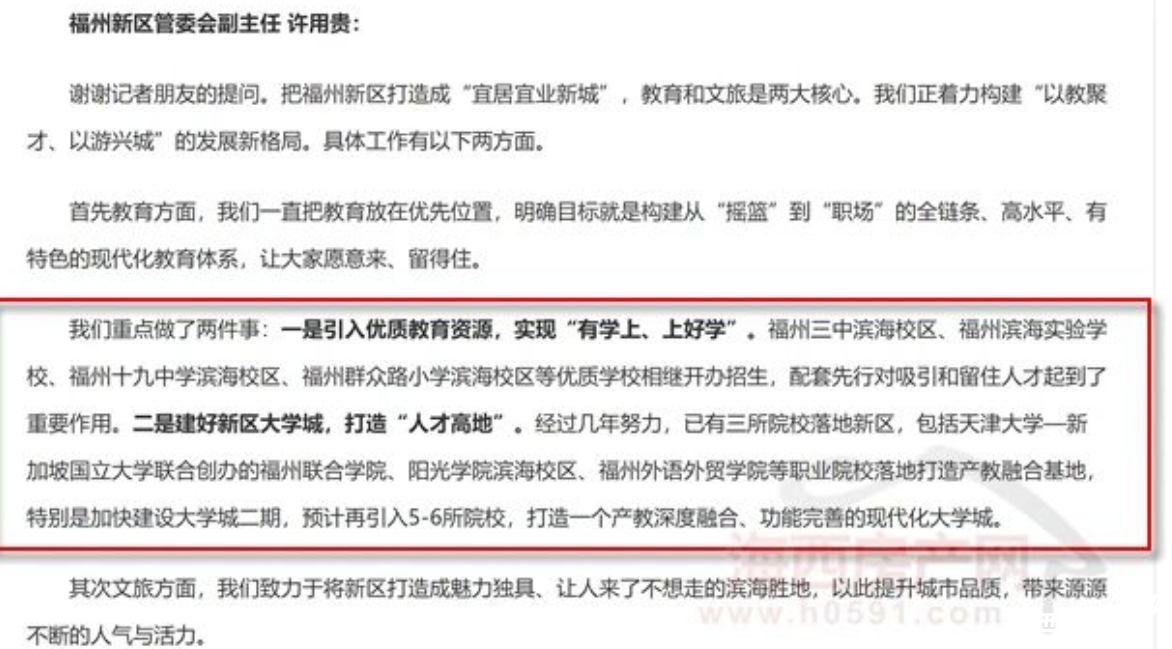 陈云水表示,新区依托职教城建设,集聚落地天津大学福州国际校区、福州外语外贸学院、阳光学院等优质院校,着力打造职业教育培训和产教融合发展的新高地。