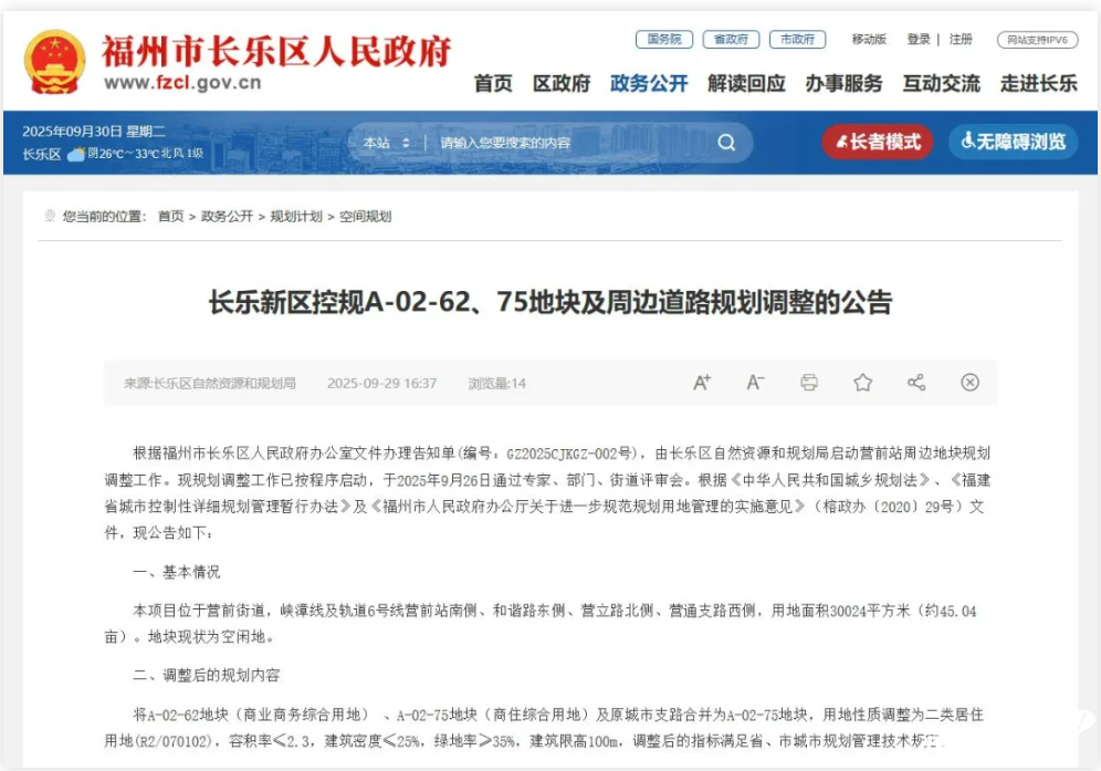 海西房产网(微信公众号:fjhxfcw)消息:2025年9月29日,长乐区自然资源和规划局发布“长乐新区控规A-02-62、75地块及周边道路规划调整的公告”。