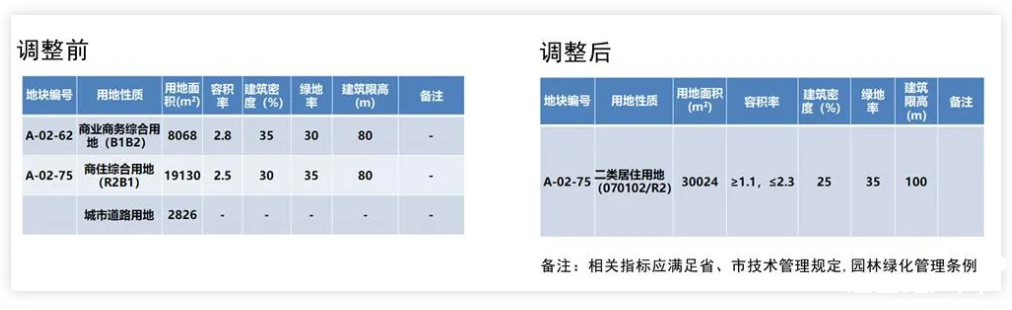 将A-02-62地块(商业商务综合用地) 、A-02-75地块(商住综合用地)及原城市支路合并为A-02-75地块,用地性质调整为二类居住用地(R2/070102),容积率≤2.3,建筑密度≤25%,绿地率≥35%,建筑限高100m,调整后的指标满足省、市城市规划管理技术规定。