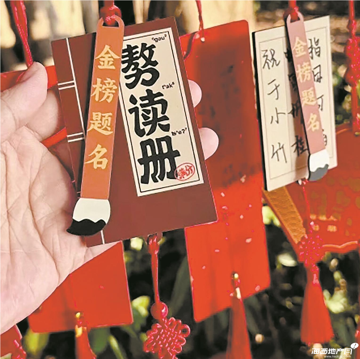 作为泉州22处世界遗产点之一,泉州府文庙不仅有着宋元州府级文庙的高规制,更以拜孔子、领红蛋、行开笔礼等活动赓续文运亨通的祝福。此次府文庙点位的贩售机内,刺桐花与滴水兽书签、城市字绘冰箱贴等文创产品错落陈列,最受关注的当数祈福牌——正面印着“敖读册”书籍与“金榜题名”状元笔图案,承载文星高照的美好寓意;背面可书写心愿,状元笔还能拆卸作为日常书签,为莘莘学子送上学业加持的文化祝福。