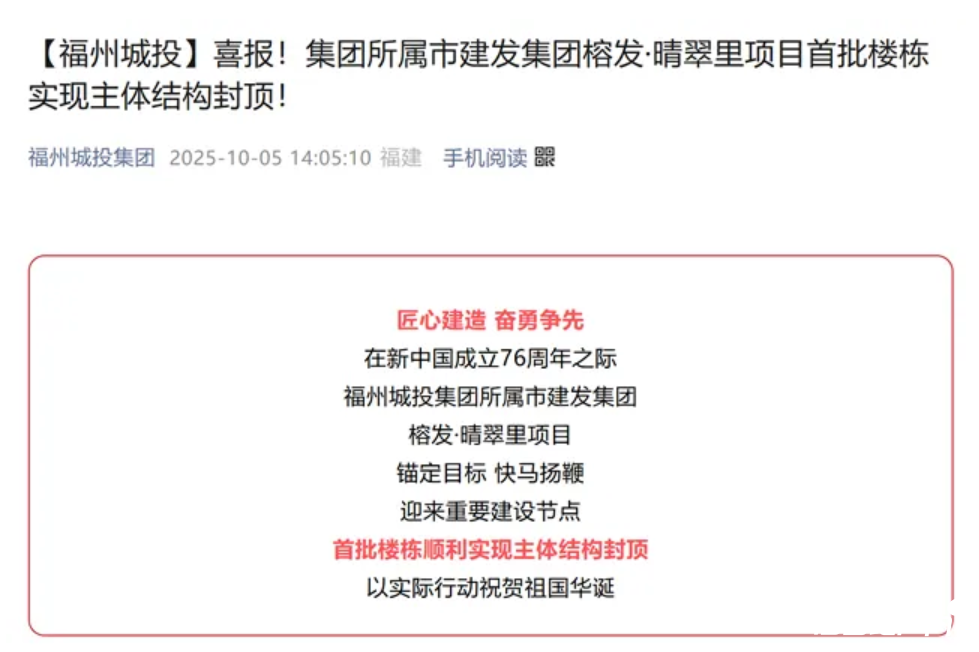 10月5日,福州城投集团对外透露,榕发·晴翠里项目迎来重要建设节点,首批楼栋(5号楼、6号楼)顺利实现主体结构封顶。