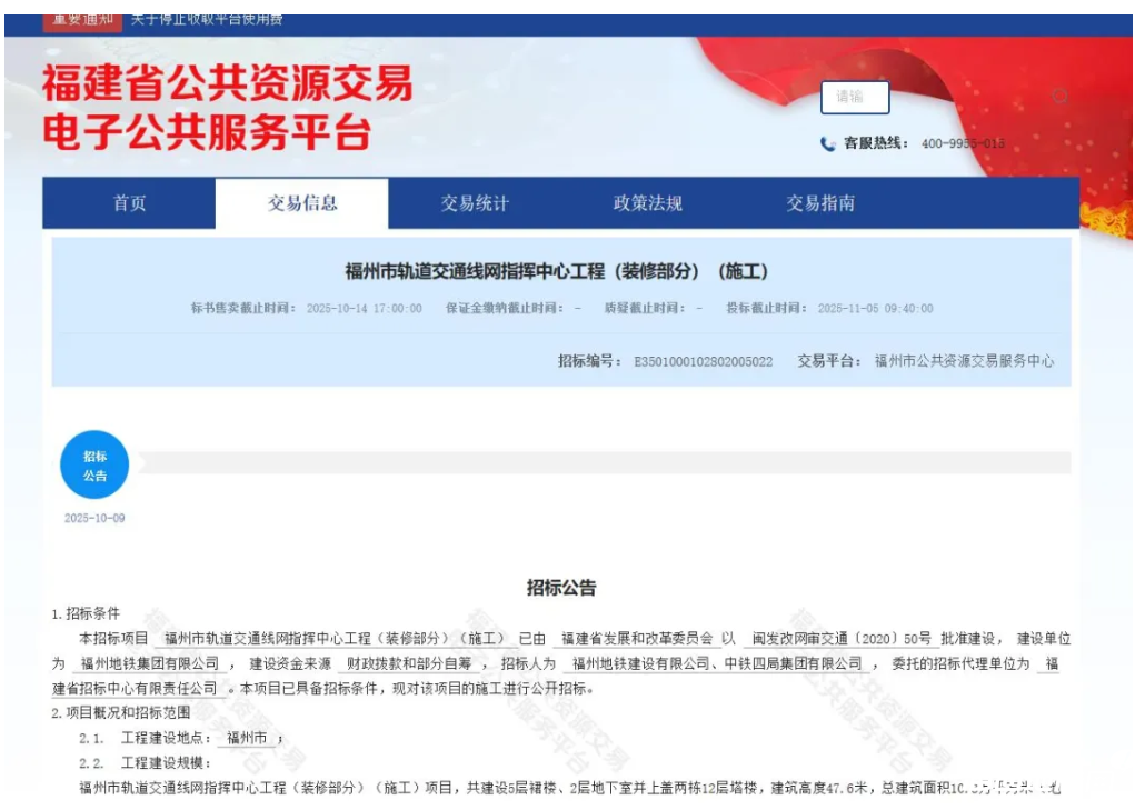 2025年10月9日,福州市公共资源交易服务中心发布“福州市轨道交通线网指挥中心工程(装修部分)(施工)”。