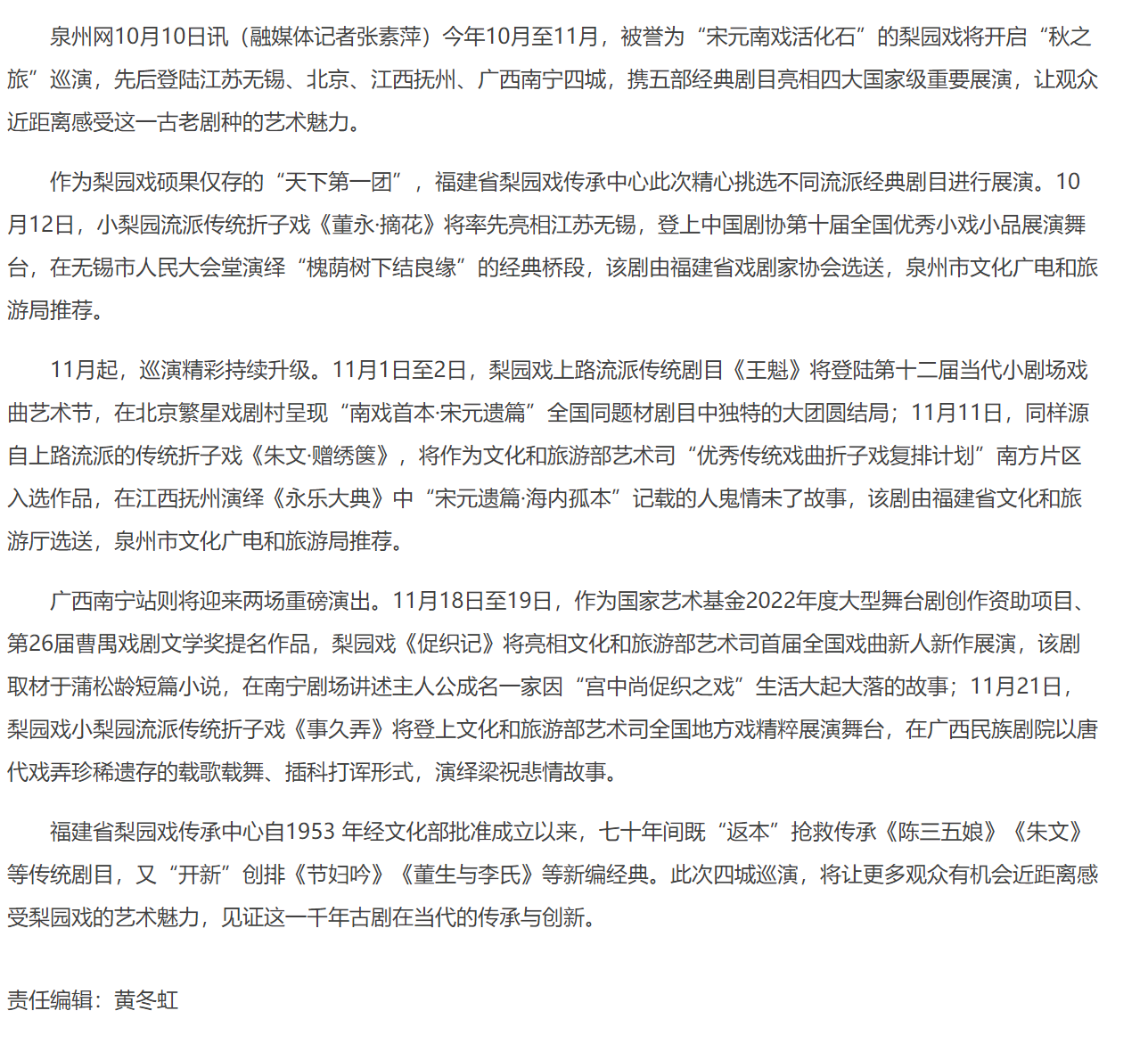 泉州梨园戏启动秋季四城巡演