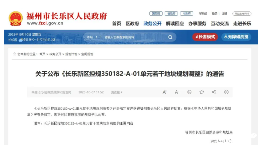 2025年10月7日,福州市长乐区自然资源和规划局发布“关于公布《长乐新区控规350182-A-01单元若干地块规划调整》的通告 ”。
