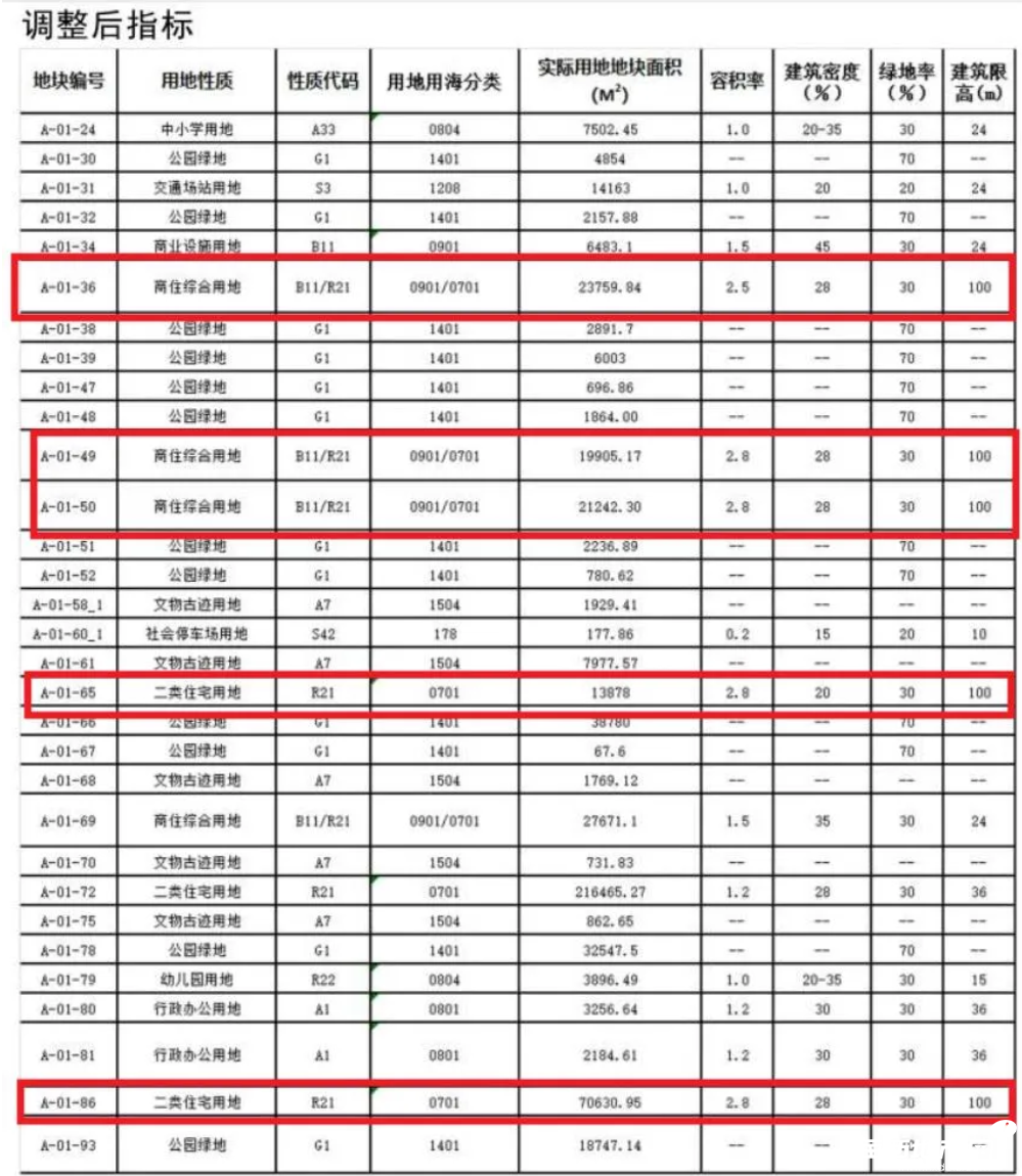地块编号A-01-36,用地性质为商住综合用地,面积23759.94平米,建筑限高100米,容积率1.5,建筑密度28%,绿地率30%。