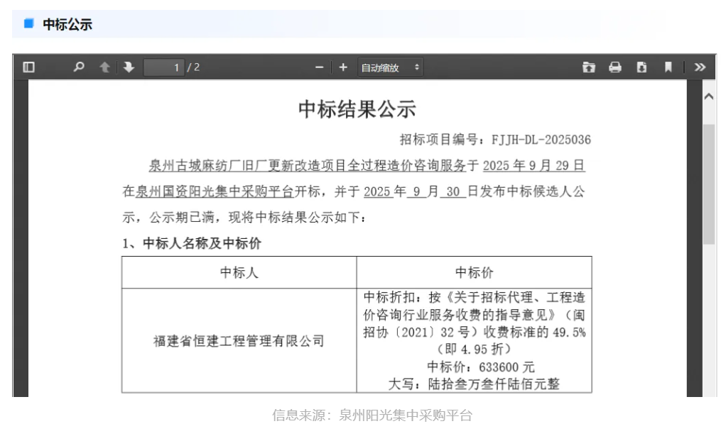 目前,《泉州古城麻纺厂旧厂更新改造项目全过程造价咨询服务》已完成招标。