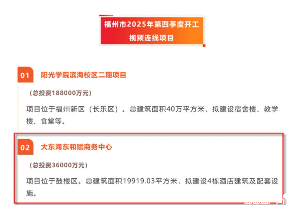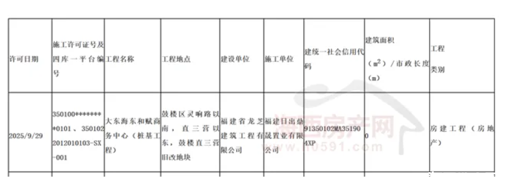 就在2025年10月10日,福州市城乡建设局发布公告,“大东海东和赋商务中心(桩基工程) ”取得施工许可证,建设单位为福建日出鼎晟置业有限公司。