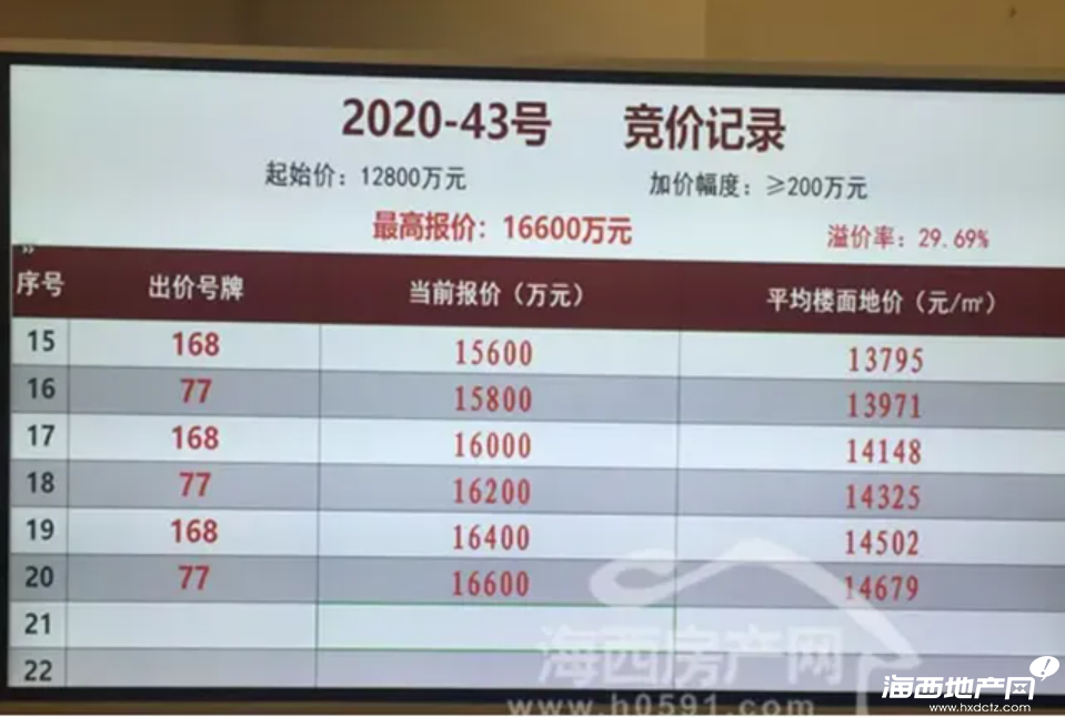 海西房产网(微信公众号:fjhxfcw)通过查询福州土地拍卖记录获悉,2020年8月28日,经过20轮竞买,77号大东海竞买人以1.66亿竞得福州宗地2020-43号(鼓楼直三营旧改地块),楼面地价14679元/㎡。
