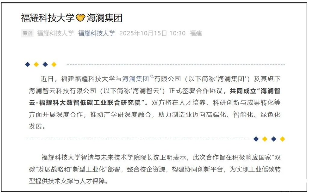 2025年8月,福耀科技大学与赛力斯集团正式签署合作协议,双方共建“赛力斯-福耀科大产教研联合实验室”。