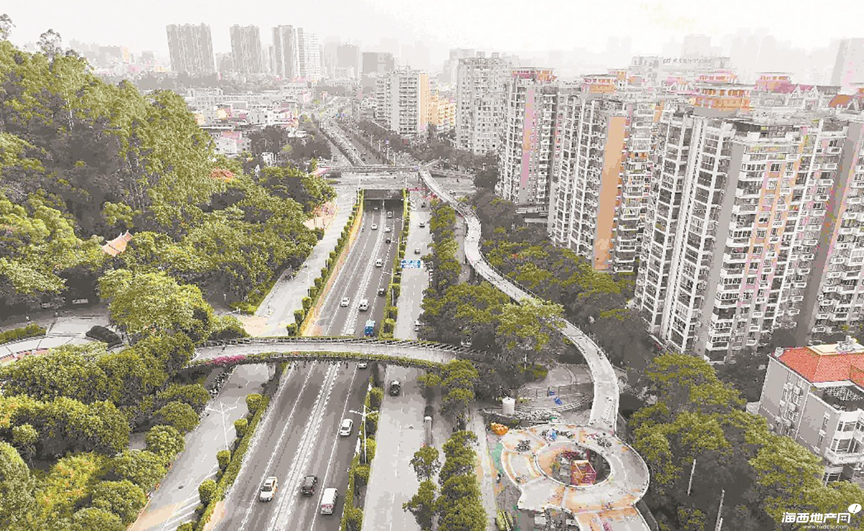 泉州市区坪山路北段在建的人行天桥(红线标注) (庄丽祥/摄)