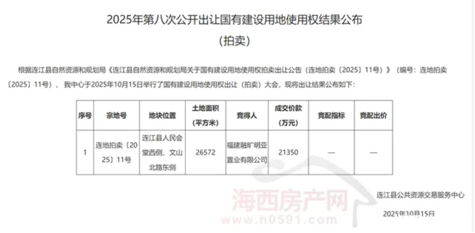 本次拍卖,共有8家竞买人先后举牌。最终,经过52轮举牌,福建融旷明亚置业有限公司以21350竞得连地拍卖〔2025〕11号,溢价5100万元,溢价率达到31.38%,成交楼面价4017.38元/㎡。