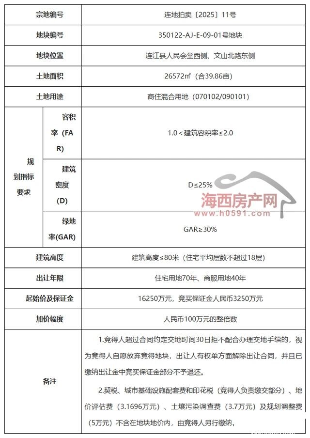 出让公告显示,连地拍卖〔2025〕11号,地块位于连江县人民会堂西侧、文山北路东侧,土地用途为商住混合用地。